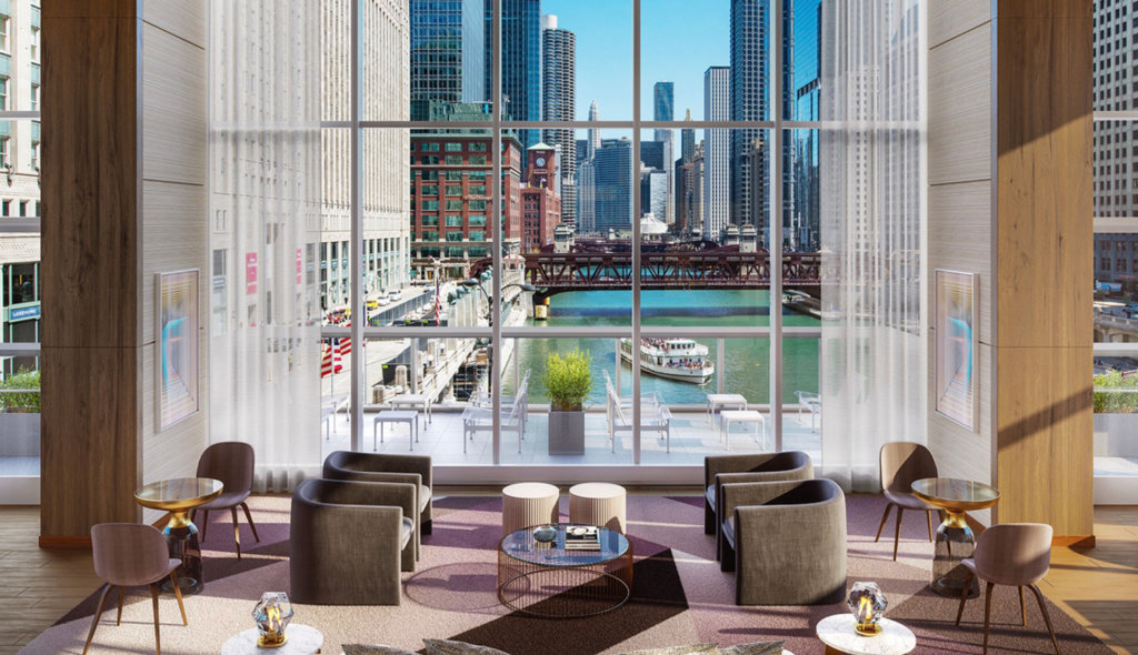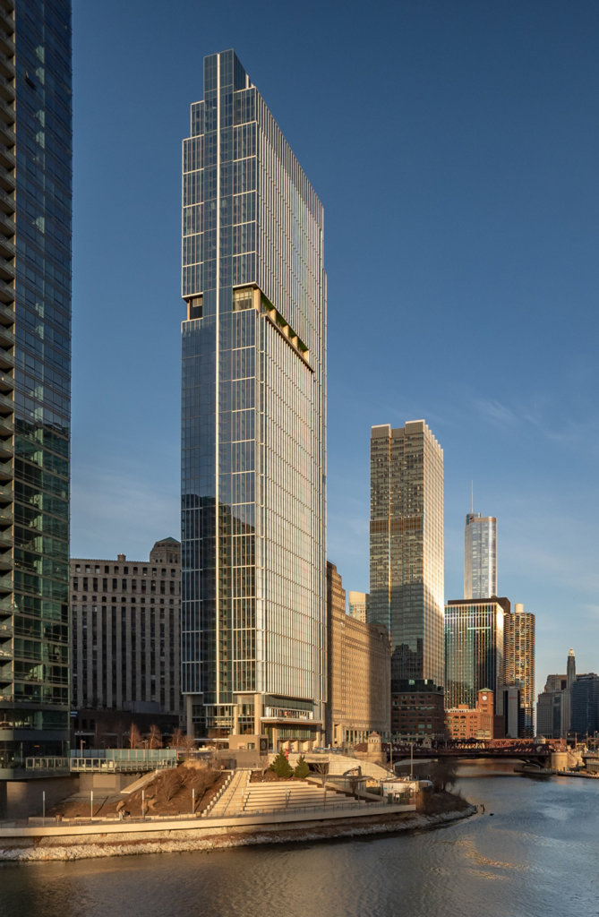 Wolf Point East rises 65-stories high above the convergence of the north and south branches of the Chicago River.