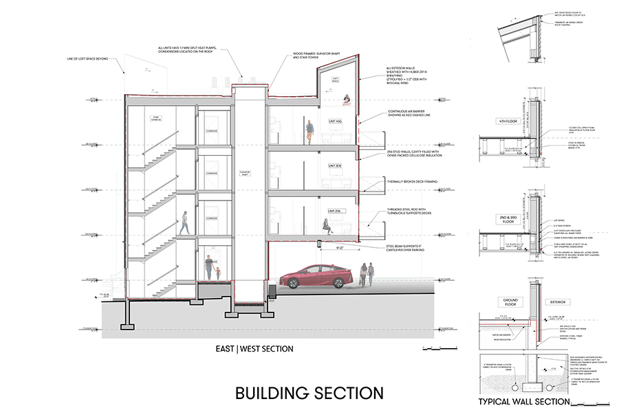 Parris Terraces boast some sustainability features and energy efficiencies that merit mention. The project installed high quality fresh air ventilation systems in each apartment, which meant the exterior enclosure could be detailed to be exceptionally airtight, utilizing an integrated air barrier product that can easily be taped and sealed, around windows/doors, and all other conditions. The wall cavity installation was all densely packed cellulose. As a firm, KTA works to limit using spray foams on all projects as much as possible to limit exposing any of the nasty chemicals to the workers on site. Cellulose was applied to fill the stud cavities, providing R-values to achieve efficiency with a sustainable material.