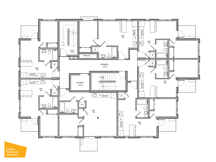 “The site was a parking lot – the city would sell it only to a developer who would provide affordable/workforce housing. As architects, we knew we needed to create a super dense, high efficiency ratio for the building. Our first obstacle was to test fitting all of the spaces, both interior and exterior, on a really small lot.”