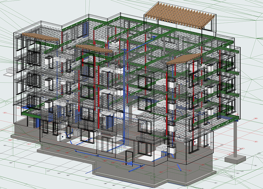 The firm employed IFC exchange for plumbing and mechanical. All the pipes were modeled. This building had virtually no duct work – but there was a question of how to get three-inch toilet drains down and across that steel beam from the parking area. During the submittal process when the firm gets shop drawings from the builder, it is their job to check and make sure that structure is where it should be and is not interfering with any major plumbing or mechanical element. Again, the Archicad model comes into play.