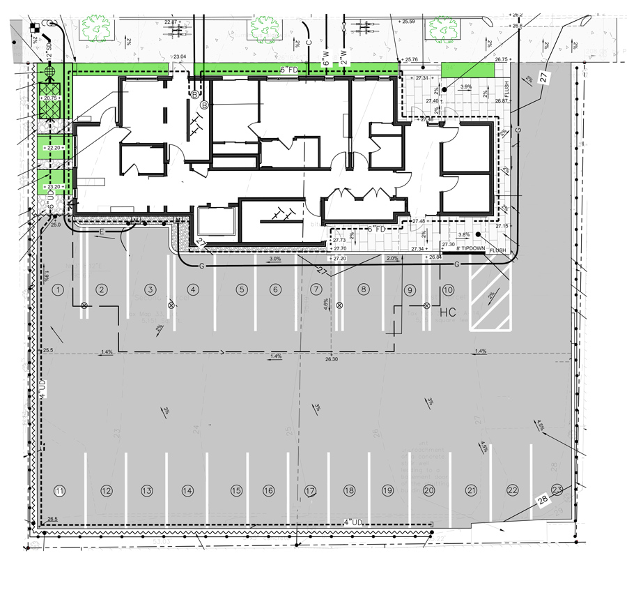 Wallace says the firm also worked with Ransom Consulting as civil engineers to evaluate where storm water would drain. The tuck under parking lot and the one-to-one parking forced the paving of 92% of the rest of the site. Civil engineers developed a rain garden to filter the water that had ran across the parking surface, by a sequence of cascading tiers of planting beds that would remove unwanted contaminants in the water before it was released into the stormwater drains.