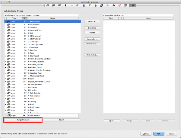 This option is often a scary one for BIM users, but using the Attribute Manager to its full potential means being able to bring Attributes from one file to another. If you remove an unused Attribute to speed operation up, then realize that you are missing a wall type, pen set, etc. you simply need to bring it back in to the attributes from your template (or an earlier version of the file). For more details on how to bring in Attributes from another file, read this post.
