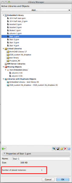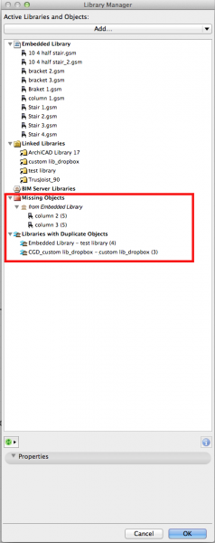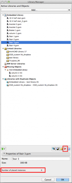 Getting rid of missing Objects is a little more tricky, and involves going through the entire project searching for missing objects. Normally I search every story, elevation, section and detail window for the large dot (the dot color depends on a pen number assigned to the missing element) that signifies a missing Object. You can then either delete or re-link these Objects to non-missing parts until the Library Manager comes out clean. If you want more information about missing Objects, check out this post that talks about the value of the .PLA).