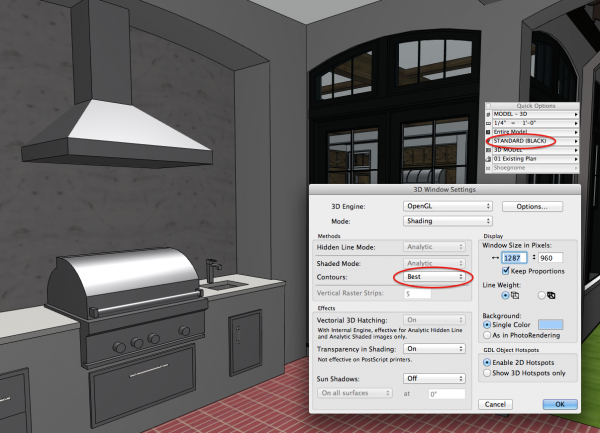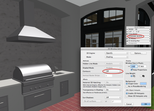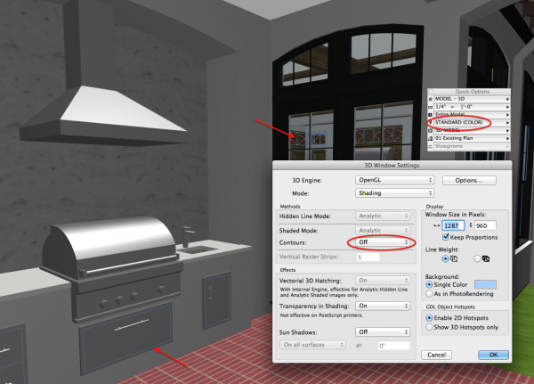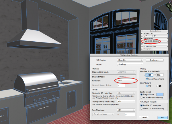 We can simply turn off the contours in the 3D Window Settings and that improves things, sort of. But it’s not perfect. You still see some door swings (which can be turned off in Model View Options), but I’ve found there are instances where not every line disappears. So with the default colored Pen Set, you still get some colored lines. I’ve highlighted some instances in the image below.